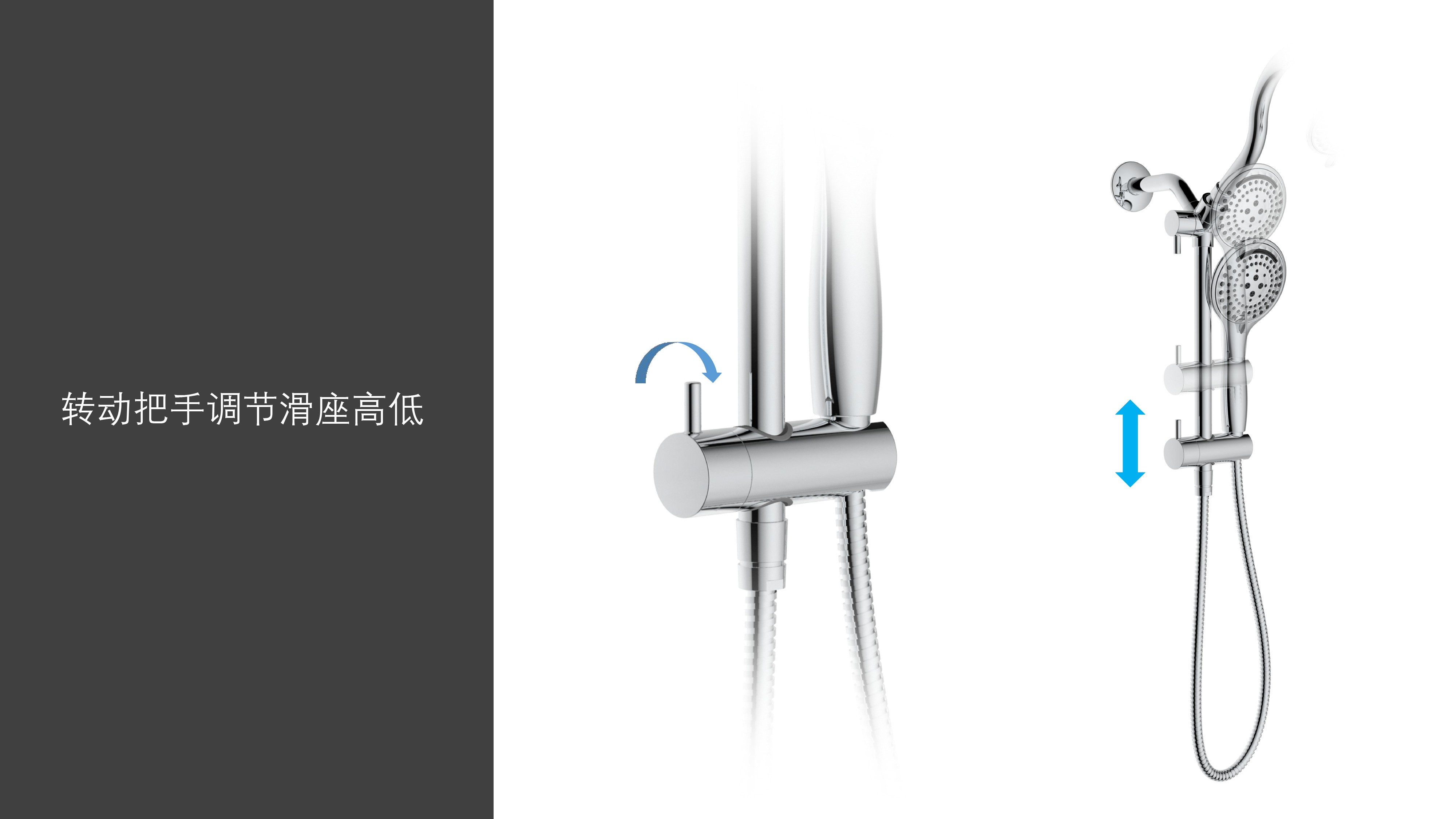 上出水彎管套裝;頂噴內(nèi)置球頭,可實(shí)現(xiàn)多角度旋轉(zhuǎn)調(diào)整;把手切換頂噴出水、花灑出水;轉(zhuǎn)動(dòng)把手調(diào)節(jié)滑座高低;帶瀑布水5功能花灑